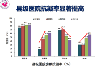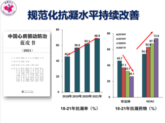 《中国心房颤动防治蓝皮书(2021)》(以下简称“蓝皮书”)介绍了由房颤所引发的相关疾病事件、生活质量改变以及由此产生的经济负担。自2018-2021年以来,抗凝率持续提升,全国整体抗凝率已由18年的45.5%提升至21年的68.9%,且华法林使用率在逐步下降,NOACs使用率逐步上升。目前全世界指南一致认为,房颤患者要优选NOACs,我国抗凝药物使用趋势符合全世界指南要求,尤其是县级医院对抗凝的管理和实践也明显提升,21年最新数据显示县域的房颤患者的整体抗凝率已达到60.9%。