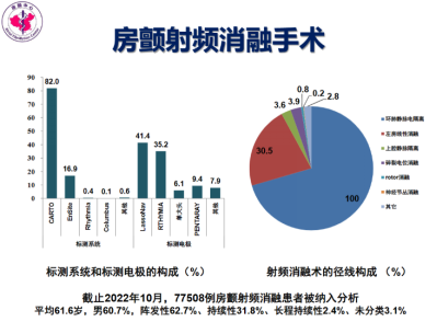 射频消融为最经典的导管消融治疗,其临床应用多年,且疗效明显,是临床使用最为广泛的治疗方式。截止2022年10月,共77508例房颤射频消融患者被纳入分析,平均年龄61.6岁。射频消融术的径线构成中环肺静脉电隔离、左房线性消融占比较重。