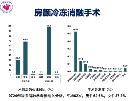 房颤冷冻消融手术常见的手术并发症为穿刺部位血肿、膈神经麻痹、少量心包积液;不良事件发生率为心衰、冠心病、脑卒中。
