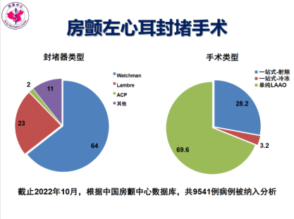 截止2022年10月,共9541例房颤左心耳封堵患者被纳入分析,患者平均年龄66.4岁,男性占58.9%,女性占41.1%。其中根据房颤左心耳封堵术中房颤类型进行统计,阵发性、持续性、长程持续性房颤分别占32.2%、49.5%、10.1%;以手术类型进行统计:一站式手术占33.5%(射频30.2%,冷冻3.3%),单纯LAAO为66.5%。
