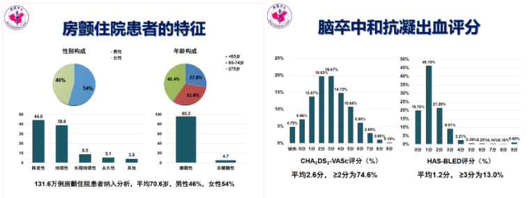 房颤住院患者中平均年龄为70.8岁,男性48.3%,女性51.7%,CHA2DS2-VASc平均2.9分,≥2分为71.0%,HAS-BLED平均1.3分,≥3分为12.5%。