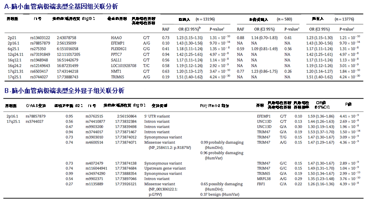 表1. CSVD极端表型全基因组关联分析与全外显子组关联分析CSVD