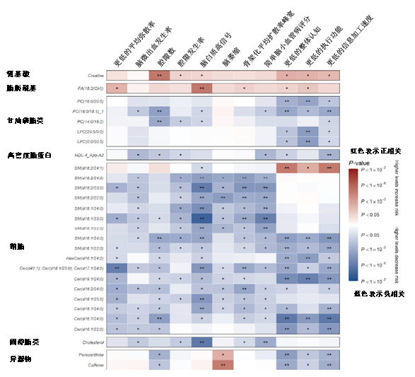 研究发现28种代谢物与CSVD影像标志物及认知相关(图7)。多种甘油磷脂和鞘磷脂水平降低与CSVD负荷增加相关,具体表现为WMH体积增加,平均弥散系数降低,归一化峰高,脑萎缩和认知损害。肌酸、FA(18:2(OH))和SM(D18:2/24:1)水平升高与腔隙数目增加、WMH体积增大和认知损害相关。基线水平较低的肉碱和肌酐水平与骨架化平均扩散率(peak width of skeletonized mean diffusivity,PSMD)的更高年化变化相关;脂蛋白亚类、氨基酸和外源性物质等25种代谢物与痴呆发病率相关。综上,研究结果显示了多个不同的代谢特征与CSVD影像标志物、认知和痴呆症有关。