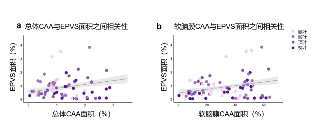 图10. 总体CAA、软脑膜CAA百分比面积与EPVS面积之间相关性