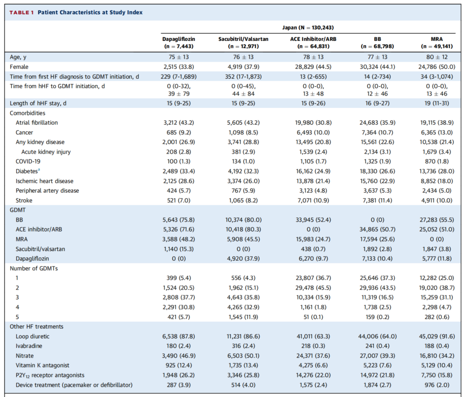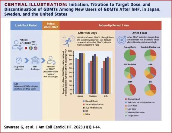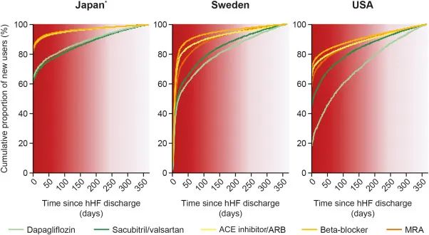 在日本、瑞典和美国,hHF后新型GDMT的启动时间明显延迟于其他GDMT。新型GDMT开始时间的延迟在伴有肾脏疾病和/或糖尿病等合并症的高危患者中更为明显。对于需要增加用量的GDMT,少有患者在开始治疗后的12个月内实现剂量达标,很多人停止了治疗。相反,达格列净与相对较低的停药率相关。这些结果表明,迫切需要早期使用新型GDMT来改善患者的预后。