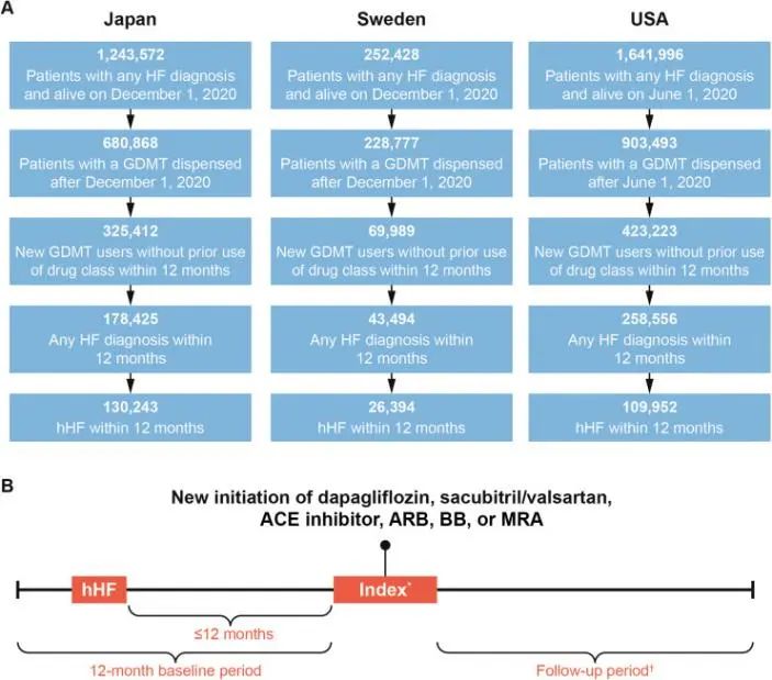 EVOLUTION HF是一项多国、观察性、纵向队列研究,纳入在日本、瑞典和美国数据库中持续存在至少12个月、有hHF记录并在住院期间或出院后12个月内新使用GDMT的成人心衰受试者(中央图示、图1A)。“新使用”定义为间隔超过12个月后重新使用GDMT。索引日期定义为任何新GDMT开始使用的日期,在该日期后的12个月内评估GDMT的使用。在hHF期间开始新使用GDMT的患者,索引日期为出院日期。