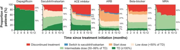 图4. hHF后新使用GDMT的患者最常用的GDMT的剂量达标和停药情况
