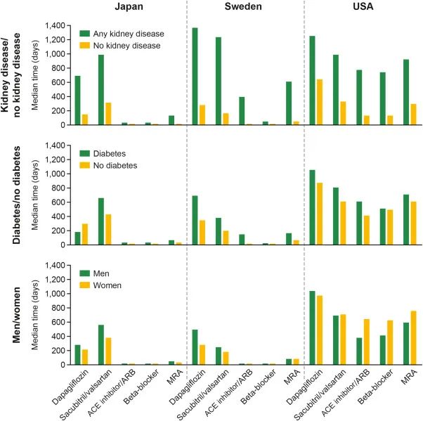有肾脏疾病的患者从首次确诊HF到开始使用GDMT的中位时间均比无肾脏疾病的患者长(图6),无论哪种GMDT。糖尿病患者从首次确诊HF到开始使用GDMT的中位时间通常也比非糖尿病患者长,但日本患者开始服用达格列净的情况则相反。在日本和瑞典,男性从首次确诊HF到启用GDMT的中位时间比女性长。在美国,对于所有GDMT,女性从首次确诊HF到启用GDMT的中位时间比男性长,而达格列净则相反。
