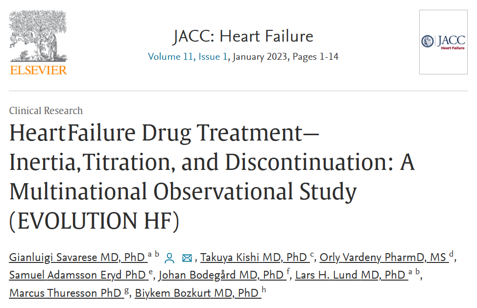 Gianluigi Savarese et al. Heart Failure Drug Treatment-Inertia, Titration, and Discontinuation:A Multinational Observational Study (EVOLUTION HF). JACC Heart Failure. 2023 Jan;11(1):1-14. doi:10.1016/j.jchf.2022.08.009. Epub 2022 Sep 7.