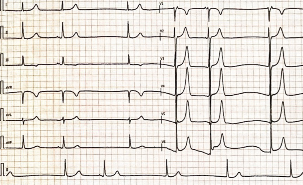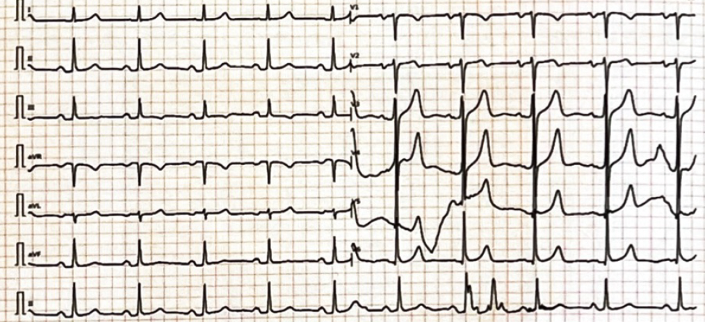 当天17:52术后回监护室,18:45顺利拔除气管插管,术后4小时复查心包超声可见少量心包积液。22:40患者突感胸痛,程度重,伴出汗,心电监护提示窦性心动过缓,心室率40次/分,血压110/69 mmHg;床旁心电图(图6)提示窦性心动过缓,室性期前收缩,下壁导联ST段抬高。