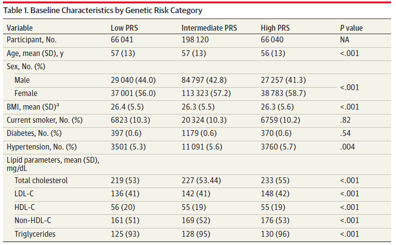共有330,201名患者被纳入英国生物样本库,中位年龄57岁(40-74),189,107名女性(57%)。低、中、高PRS组在年龄、糖尿病、高血压或吸烟状况方面,没有临床意义上的差异(表1)。高遗传风险组的女性比例略高于低风险组(38,783 [58.7%] vs 37,001 [56.0%])。同时,高遗传风险组的低密度脂蛋白胆固醇水平(148 [42%] vs 136 [41%])、非高密度脂蛋白胆固醇水平(176 [53%] vs 161 [51%])和甘油三酯(130 [96%] vs 125 [93%])均显著高于低遗传风险组,各个年龄段有明显的临床差异。