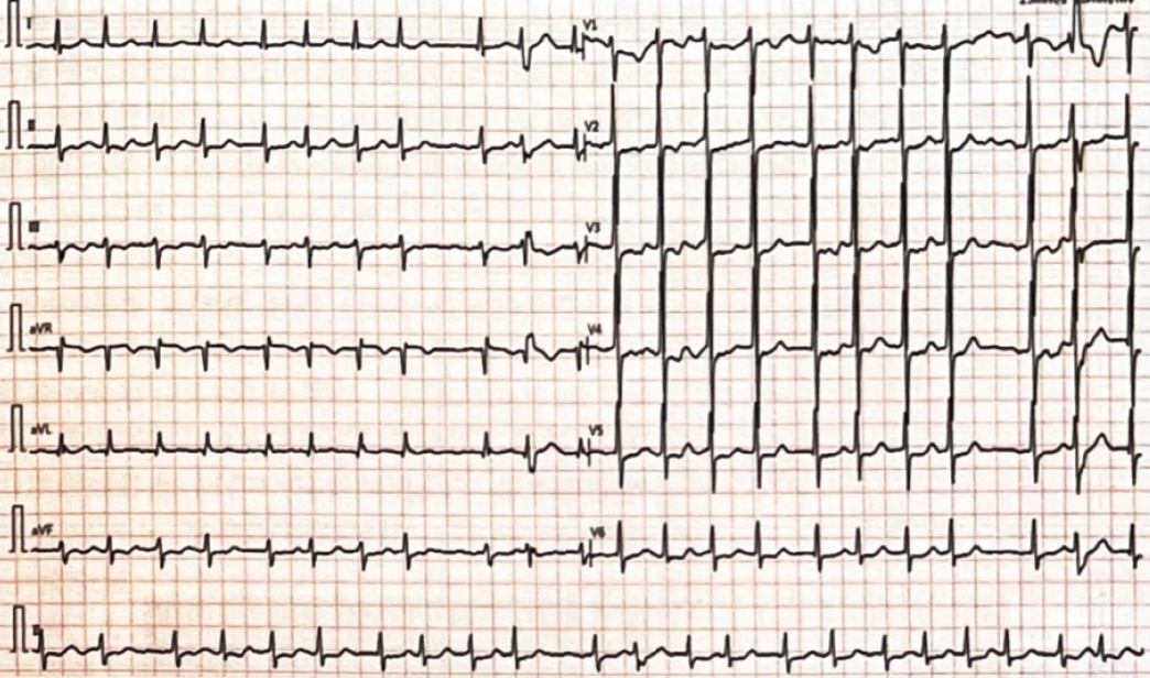 心电图示心房颤动伴快速心室反应,ST-T改变(图1)。X线胸片示双肺未见实变,双膈光整,心影正常。