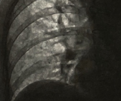 患者行胸部CT(图3)显示右肺下叶节段性膨胀不全,未见气胸表现,同时可见双侧胸腔少量积液,心影增大不明显,暂排除肺部感染、气胸、心力衰竭疾病,X线胸片(图4)提示右侧膈肌上抬,透视检查可见右侧膈肌抬高,运动幅度明显减弱(图5)。常见引起膈肌抬高的常见原因有:①肝脏占位、脓肿;②肺不张引起肺容积缩小;③膈肌麻痹。结合此患者房颤消融史,考虑可能为房颤射频消融术引起了膈神经损伤,然后出现了膈肌麻痹。