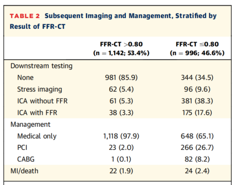 在进行CT-FFR分析的2298例CCTA影像中,有160例(7.0%)因图像质量不佳而排除。1142例(53.4%)CT-FFR > 0.80(表2)。其中,161例(14.1%)接受负荷成像或ICA进一步评估,24例(2.1%)患者进行了血运重建。996例(46.6%)患者的CT-FFR报告为#0.80。其中,652例(65.4%)接受了负荷成像或ICA的进一步评估,348例(34.9%)患者进行了血运重建术。344例CT-FFR≤0.80的患者未接受进一步评估。