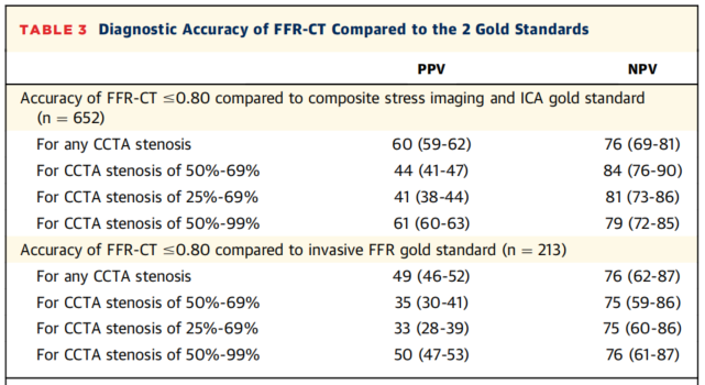 与652例患者的“复合负荷成像和ICA金标准”相比,对于任何程度的CCTA狭窄,CT-FFR的阳性预测值(PPV)和阴性预测值(NPV)分别为60%和76%(表3)。对于50%-69%、25%-69%和50%-99%的CCTA狭窄,PPV分别为44%、41%和61%。与213例患者的“有创性FFR金标准”相比,对于任何程度的CCTA狭窄,CT-FFR的PPV和NPV分别为49%和76%(表3,中心图示C)。对于50%-69%、25%-69%和50%-99%的CCTA狭窄,PPV分别为35%、33%和50%。