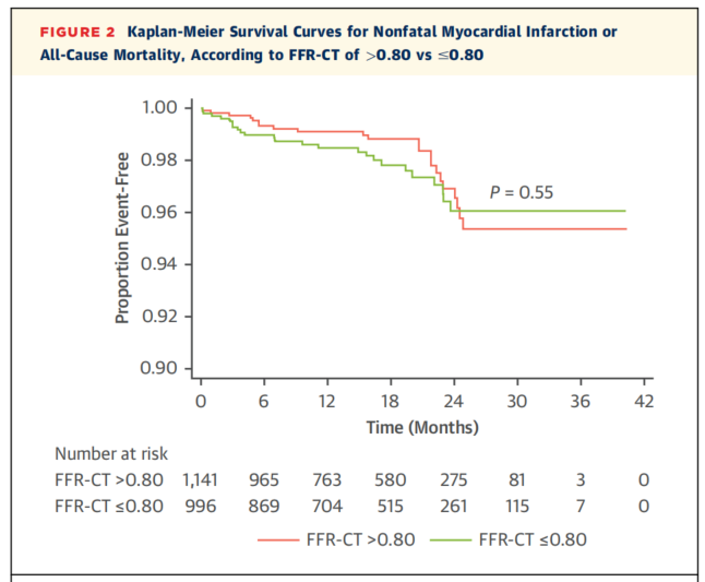 在平均17 ± 9.4个月的随访期间,共发生46例事件(14例非致命性心梗和32例死亡),其中CT-FFR>0.80和CT-FFR≤0.80的患者事件率分别为1.9%和2.4%(表2)。生存分析显示,所有因素均与至事件发生的时间无显著相关性(图2)。