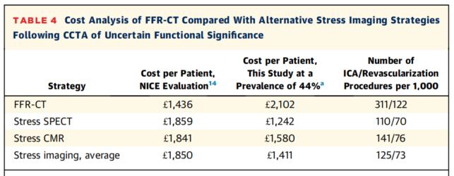 在接受有创FFR的人群中,观察到阻塞性CAD患病率为44%,CT-FFR策略的成本为2102英镑(表4,中心图示D)。负荷成像策略更便宜,平均成本为1411英镑。