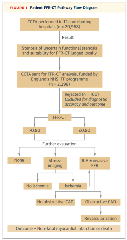 审核标准包括仅在有稳定胸痛和可疑狭窄(50%-69%)的患者中进行CT-FFR分析。诊断准确性根据有创性血流储备分数进行评估。对非致死性心肌梗死和全因死亡率进行随访。并采用成本分析模型,将CT-FFR策略的成本与其他负荷成像策略进行比较。