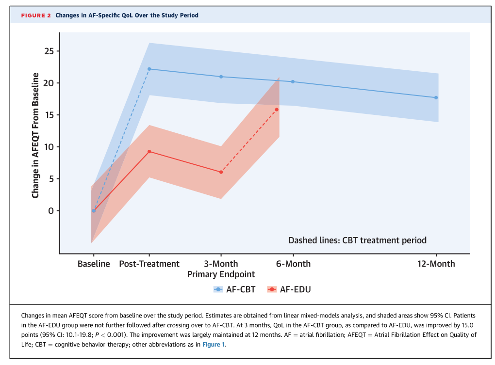 在3个月时,接受10周CBT治疗的患者在房颤对生活质量(AFEQT)问卷调查的总得分方面较标准治疗组高15分(P<0.001),这一优势在12个月的随访中持续存在。结果还显示,与对照组相比,与心脏相关的医疗保健就诊减少56%(P=0.027)。