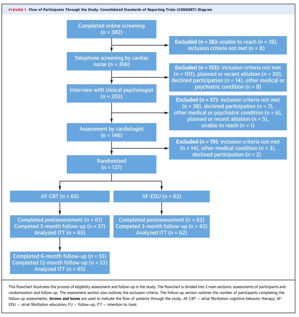 该研究随机分配127名阵发性房颤患者,他们都有房颤症状,表现为困扰或日常活动受限,分别有65名和62名患者接受在线CBT计划或接受标准房颤患者教育。所有患者均接受最佳药物治疗,并计划进行导管消融或最近接受了手术。(如图1示)