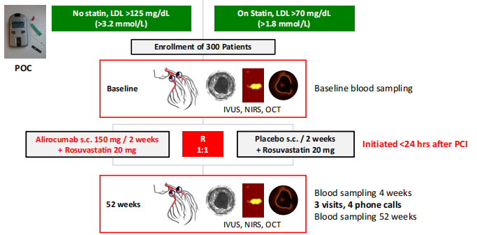 在PCI后24小时内和52周时使用三种冠脉内影像学手段对两个非梗死相关动脉进行评估:冠状动脉血管内超声(IVUS)、近红外光谱(NIRS)和光学相干断层扫描(OCT)。主要终点为从基线到第52周的IVUS衍生的动脉粥样硬化体积百分比(Percent atheroma volume,PAV)的变化。两个次要终点分别是从基线到第52周,NIRS衍生的4 mm内最大脂质核心负荷指数(max LCBI 4 mm)和OCT衍生的最小纤维帽厚度(FCTmin)的变化(图2)。
