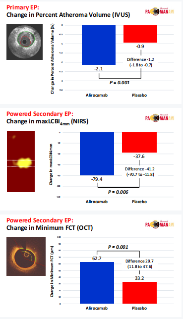 结果表明,AMI患者在高强度他汀类药物治疗基础上加用阿利西尤单抗,能够更有效地降低PAV和脂质负荷,增加FCTmin,稳定、逆转非梗死相关动脉斑块。