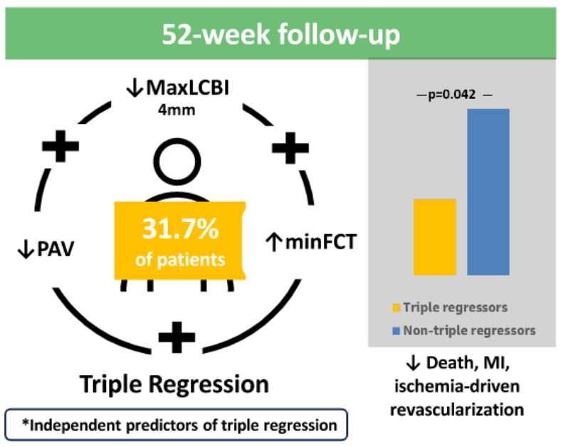 研究共纳入265例接受高强度他汀类药物治疗的患者(537例非梗死相关冠脉)。研究引入一个新概念,即“三重逆转”。同时表现出动脉粥样硬化体积减小和斑块稳定即为“三重逆转”,由PAV减少、max LCBI 4mm减少和FCTmin增加的综合存在来定义。在一年的随访中评估有或没有“三重逆转”的患者的临床结果。