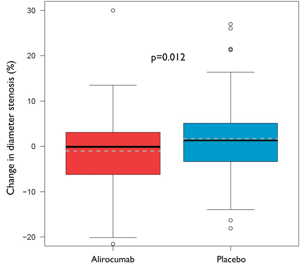 与安慰剂相比,阿利西尤单抗治疗AMI患者52周后,血管造影的DS%显著下降。虽然与安慰剂相比,阿利西尤单抗未观察到冠脉血流动力学的总体改善,但在基线QFR ≤0.95的患者中发现了阿利西尤单抗的潜在获益。