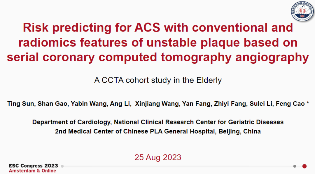 编者按:当地时间8月25日,欧洲心脏病学会年会(ESC 2023)上,解放军总医院第二医学中心曹丰教授团队进行了题为“Risk predicting for acute coronary syndrome with conventional and unstable plaque radiomics features from serial coronary computed tomography angiography(传统影像特征联合不稳定斑块影像组学特征预测急性冠状动脉综合征风险)”的发言,研究结果显示将传统的冠状动脉CTA的高危斑块特征与不稳定斑块的影像组学特征相结合建立模型,有助于更好地预测急性冠状动脉事件。