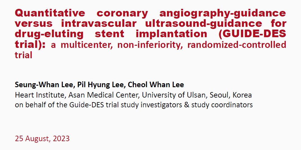 目前冠状动脉造影对血管狭窄程度的评判依旧主要依靠目测,这难免会出现误差, IVUS有效弥补了这一缺陷。然而在某些条件下,IVUS技术未能良好普及,那么QCA是否可作为IVUS的替代方案呢?2023年ESC大会发布的GUIDE-DES试验结果给出了肯定答案。