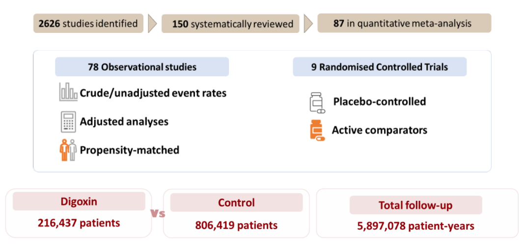 本系统综述纳入150项研究,其中87项进行了荟萃分析,包括78项观察性研究和9项随机对照研究,共纳入1 022 856名患者,216 437名患者接受地高辛治疗,806 419名患者接受了对照治疗,如无治疗、安慰剂或活性对照药物(包括心率、节律控制及其他心衰治疗),共计5 897 078个患者年的随访(图2)。