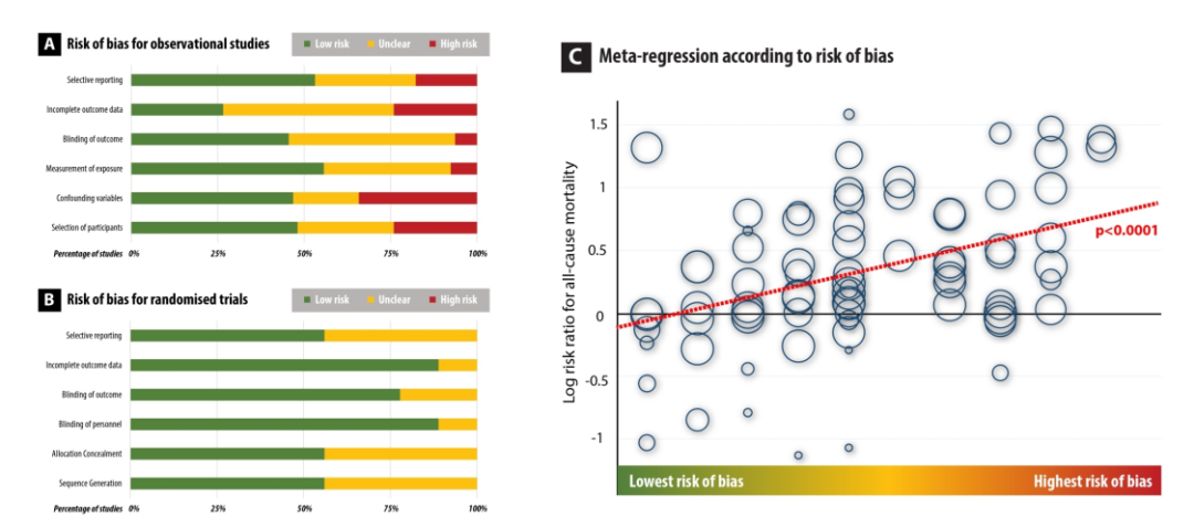 全因死亡率与研究的偏倚风险之间存在直接相关性,荟萃回归系数为1.10 (95%CI:1.05-1.14;P<0.0001)。具有较高偏倚风险的研究更有可能报告地高辛与额外死亡率之间的关联(图5)。