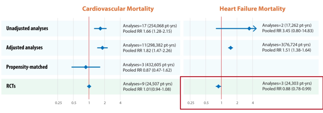 观察性研究中,接受地高辛治疗组的心血管疾病和心力衰竭相关死亡率高于未治疗组。随机对照研究显示,与安慰剂或活性药物对照组相比,地高辛对心血管疾病死亡率没有影响(RR 1.01,95%CI:0.94-1.08,P=0.81,I2=0%),显著降低心力衰竭相关死亡率(RR 0.88,95%CI:0.78-0.99;P=0.035,I2=0%)(图6)。