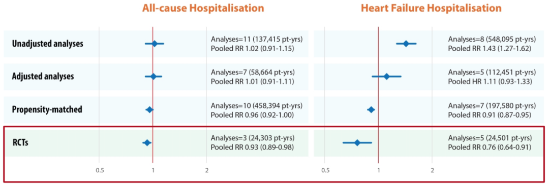 观察性研究中,接受地高辛治疗组的全因住院率和心力衰竭相关住院率高于未治疗组。在随机对照研究中,与安慰剂或活性药物对照组相比,地高辛治疗显著降低全因住院率(RR 0.93,95%CI:0.89-0.98,P=0.008,I2=62%)和心力衰竭相关住院率(RR 0.76,95%CI:0.64-0.91,P=0.003,I2=26%)(图7)。