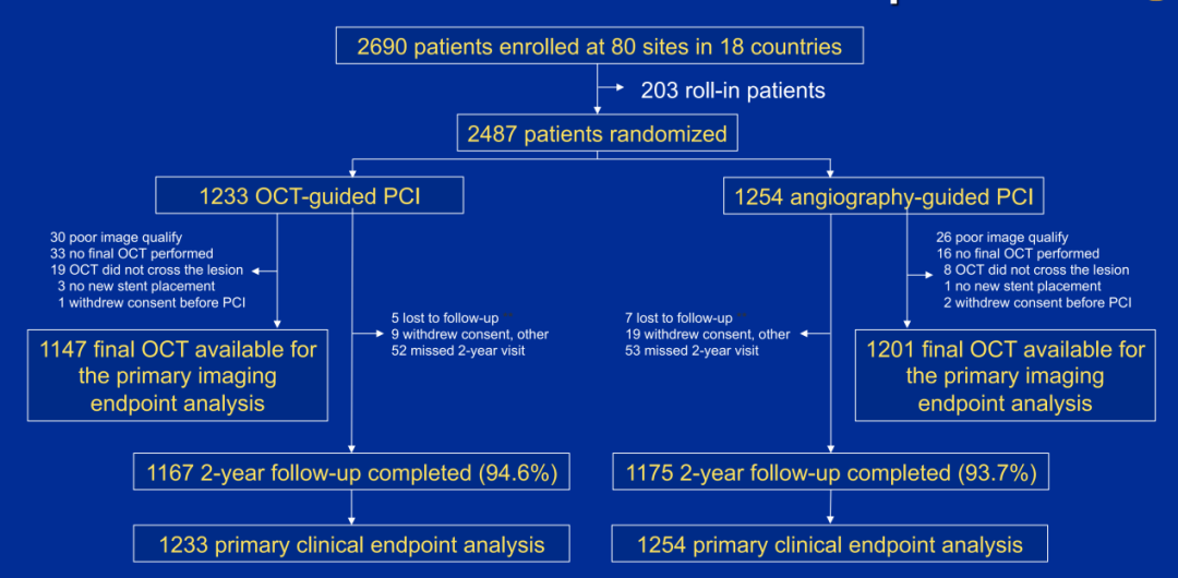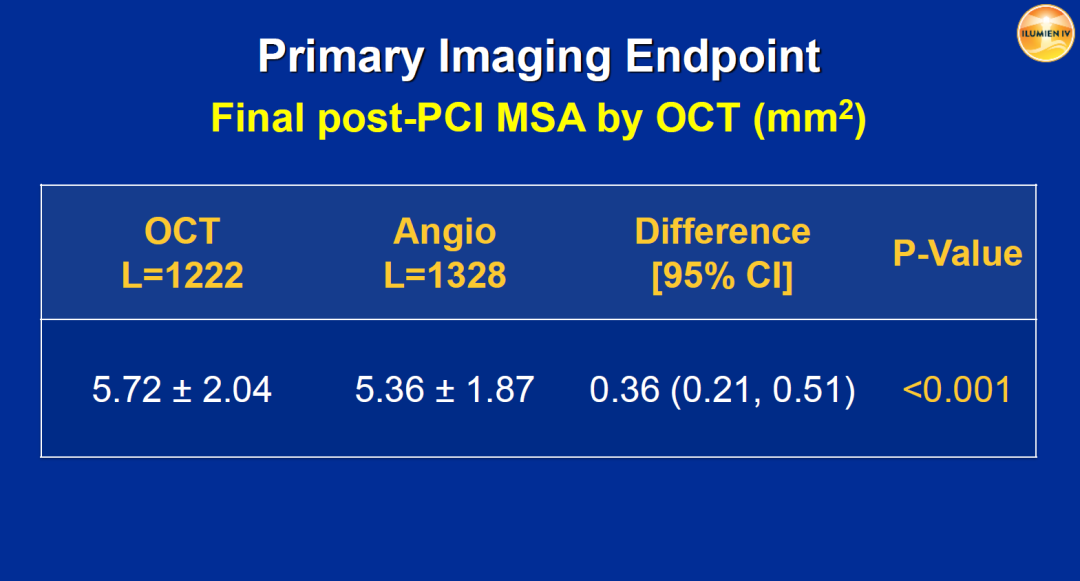 ILUMIEN IV研究是一项前瞻性、单盲、随机、对照试验研究,共纳入2487例具有高风险临床特征(接受药物治疗的糖尿病)和/或具有高危病变特征的患者,包括心肌梗死、长于28 mm支架治疗的长病变和多个病变、需要植入2个支架的分叉病变、严重钙化病变、慢性完全闭塞病变、弥漫或多个局限性的支架内再狭窄病变等。入组患者随机分为OCT指导(1233例)和造影指导(1254例)的冠脉支架植入组。主要影像学终点是OCT评估的MSA,主要临床终点为靶血管失败(TVF),定义为2年内心源性死亡、靶血管心肌梗死或缺血驱动的靶血管血运重建的复合终点;安全性终点是支架内血栓和手术并发症4。