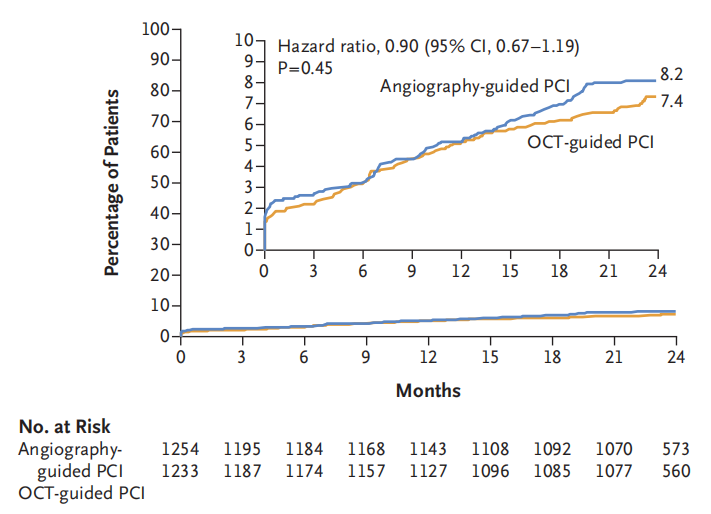 不过令人遗憾的是,在主要临床终点方面,OCT指导组术后2年内共88例出现靶血管失败(7.4%),而造影组为99例(8.2%),无统计学差异(HR 0.90;95%CI:0.67-1.19,P=0.45)。