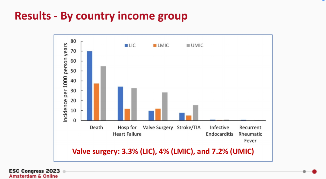 研究发现,相比中高收入或中低收入国家,低收入国家的患者人群中,除卒中外的并发症更普遍,接受瓣膜手术治疗的比例更低(图1)。此外,低收入国家的患者入院死亡率更高。