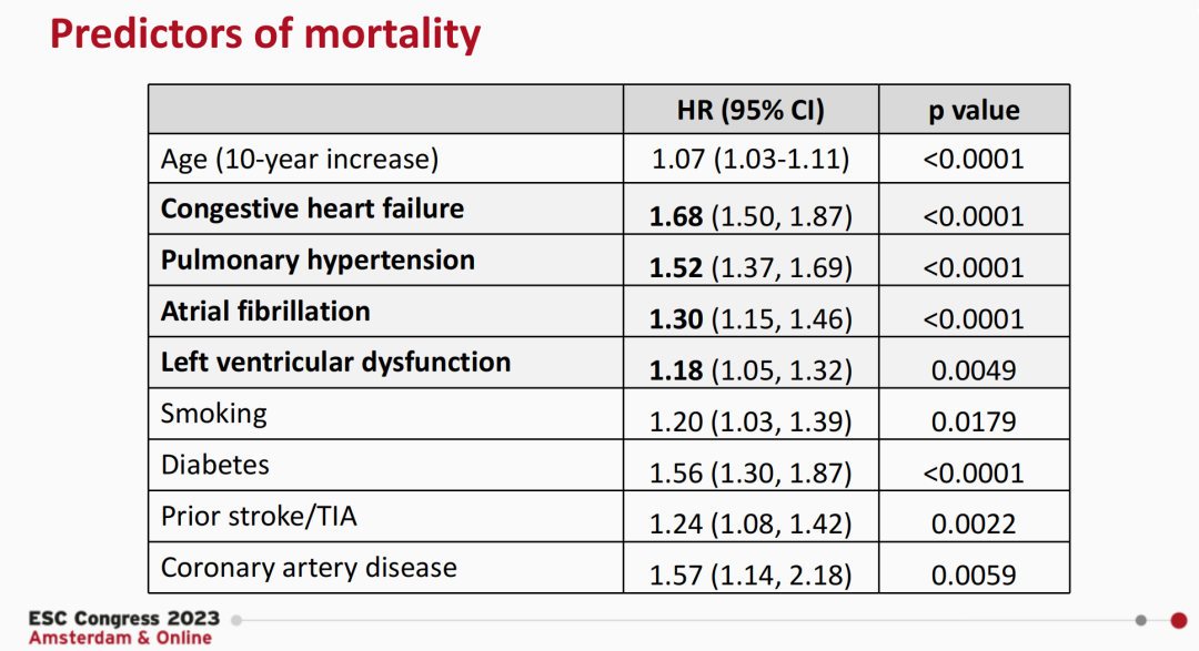 全因死亡率的独立预测因素包括:充血性心力衰竭(HR 1.68,95%CI:1.50-1.87, P<0.0001),肺动脉高压(HR 1.52,95% CI:1.37-1.69, P<0.0001),心房颤动(HR 1.30,95%CI:1.15-1.46, P<0.0001),左室收缩功能障碍(HR 1.18,95%CI:1.05-1.32, P=0.0049),瓣膜成形手术(HR 0.24,95%CI:0.06-0.95,P=0.042)或瓣膜置换手术(HR 0.23,95%CI:0.12-0.44,P<0.0001),中高收入(HR 0.57,95%CI:0.34-0.94, P=0.0287)或中低收入国家(HR 0.49,95%CI:0.31, 0.76,P=0.0016)(图2 ,3)等。