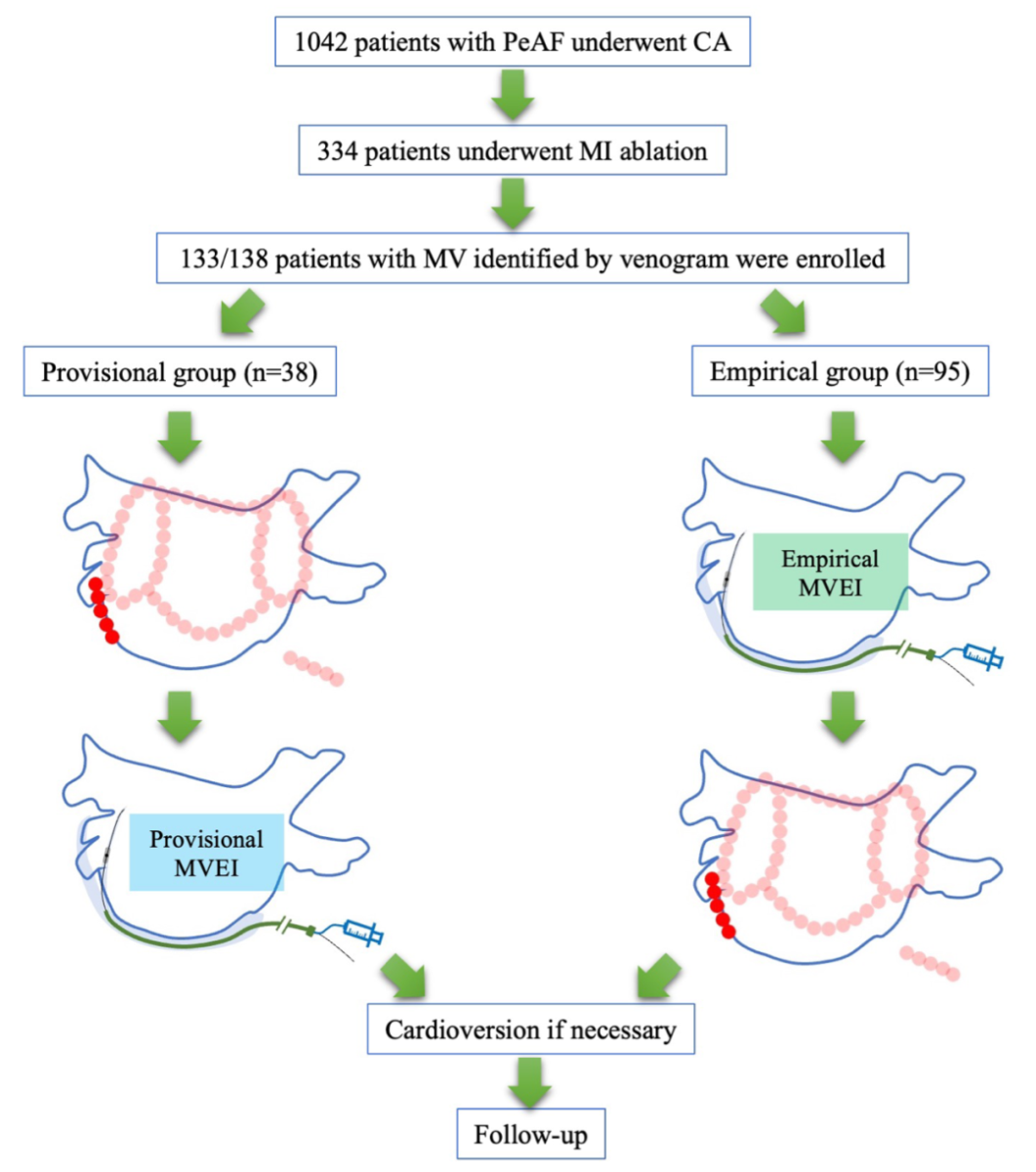 该研究从1042例连续接受导管射频消融的PeAF患者中入组了133例行首次导管消融并完成二尖瓣峡部(MI)线性消融的患者,根据其术中不同的MVEI策略分为经验性MVEI组(95例,于传统导管射频消融前先行MVEI消融)或按需性MVEI组(38例,先行传统PeAF导管消融,若仍无法达到跨MI双向传导阻滞或仍有MI依赖性房性心律失常时,再行MVEI消融)(图1)。