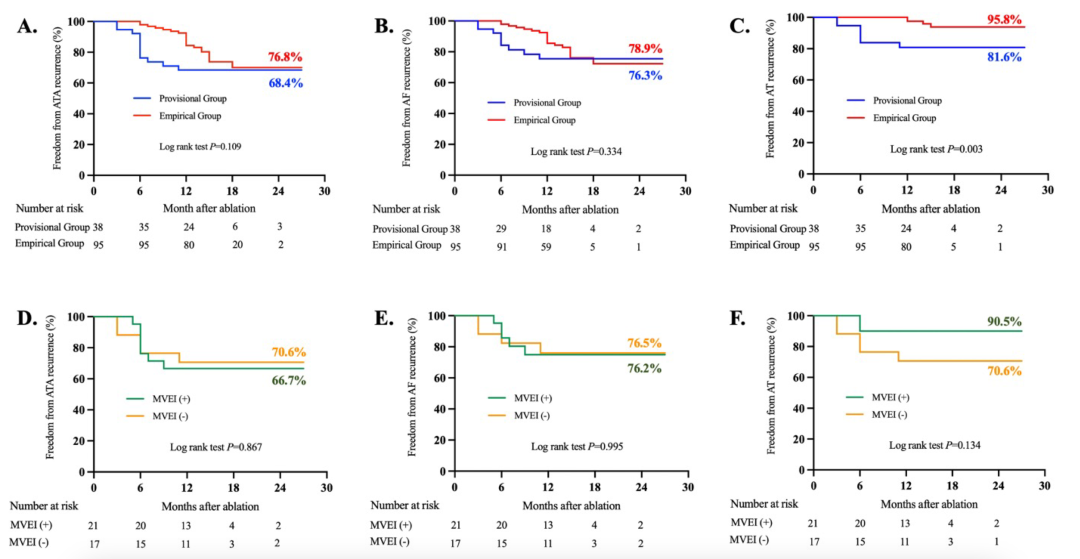 经过平均16个月的随访,尽管两组在房颤及快速性房性心律失常(ATA,包括AF及AT)发生率方面未见显著差异,但经验性MVEI组术后房速的复发率显著更低(P=0.003)(图2)。回归分析显示,经验性MVEI与PeAF消融术后更低的AT复发率独立相关。