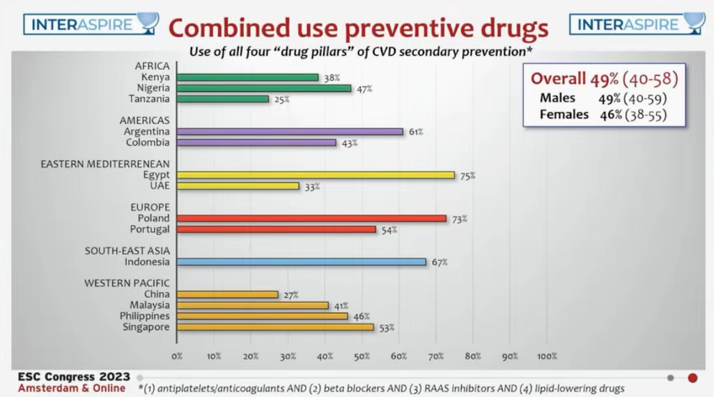 结果表明,在全球范围内,实现循证生活方式和完成医疗风险因素控制目标的情况不佳。如图1所示,仅有不到一半的参与者服用心血管疾病二级预防的4个“关键药物”(①抗血小板药物;②β受体阻滞剂;③RAAS抑制剂;④降脂药物)。
