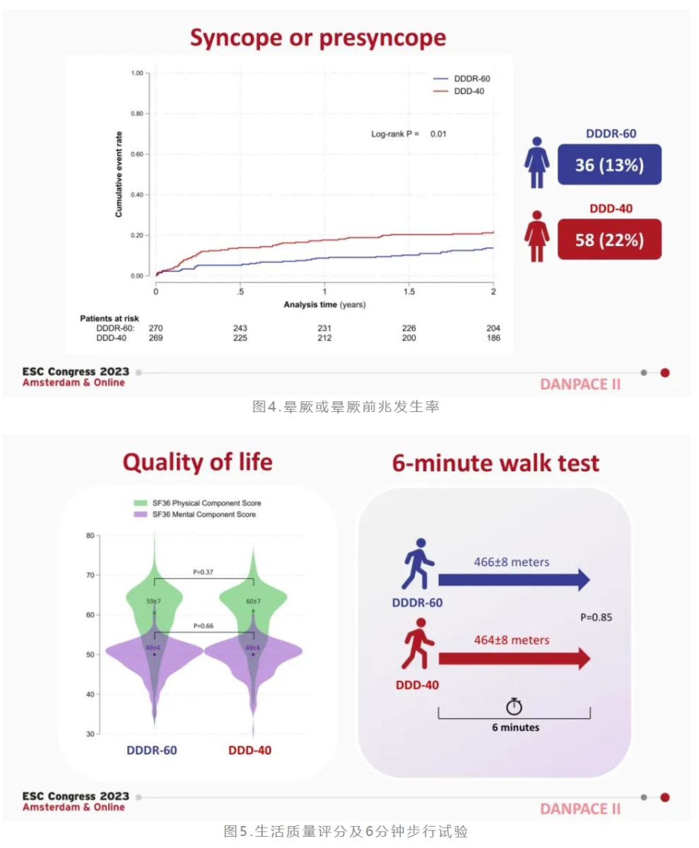 次要终点方面,与DDD-40相比,DDDR-60晕厥或晕厥前兆发生率更低:DDD-40组58/269(22%),DDDR-60组36/270(13%),两组生活质量评分及6分钟步行试验均无统计学差异。