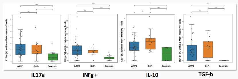结果显示,与Control组相比,在外周血单核细胞中c-Met+T细胞在ARVC组及G+P-组显著升高(P<0.01),并且,与Control组相比,ARVC组及G+P-组中的细胞因子IL17a、INFg、IL10、TGF-β显著升高(P<0.001)(图1)。