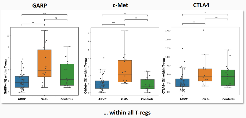 尽管Treg细胞在各组中无差异,但与ARVC组及Control组相比,表达GARP、c-Met及CTLA4的Treg细胞在G+P-组中显著升高。并且c-Met阳性Treg细胞与G+P-组患者24小时室性早搏数量