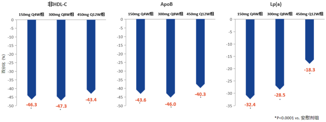 2.非HDL-C、ApoB、Lp(a):与安慰剂相比,瑞卡西单抗150 mg Q4W和450 mg Q12W治疗12周以及300 mg Q8W治疗16周后,非HDL-C、ApoB、和Lp(a)水平较基线均显著降低(图4)。