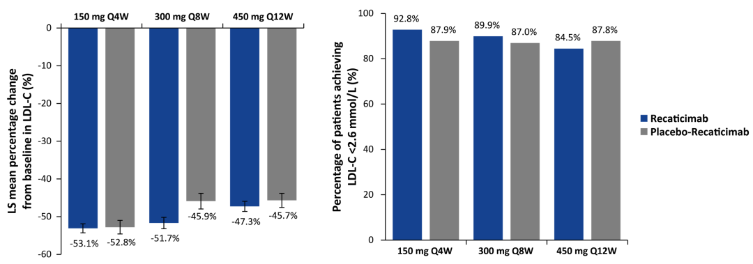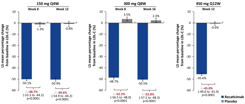研究主要终点为与安慰剂相比,瑞卡西单抗150 mg Q4W和450 mg Q12W治疗12周以及300 mg Q8W治疗16周后,非家族性高胆固醇血症和混合型高脂血症患者的LDL-C相较于基线变化的百分比。