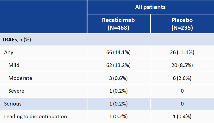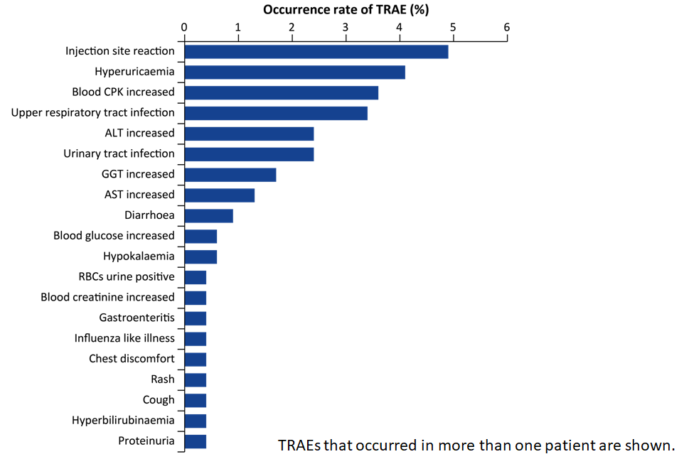 在双盲核心治疗期间,瑞卡西单抗组和安慰剂组的治疗相关不良事件(TRAE)发生率相当,即瑞卡西单抗组468例患者中有66例(14.1%)发生TRAE,安慰剂组235例中有26例(11.1%)发生TRAE,且大多数为轻度(表1)。在24周瑞卡西单抗治疗中,最常见的TRAEs是注射部位反应和高尿酸血症,发生率均<5%(图6)。