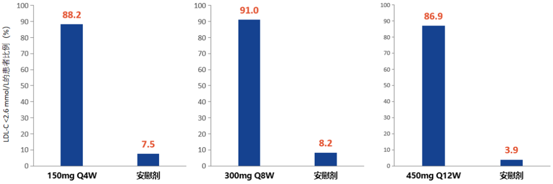 1.LDL-C<2.6 mmol/L的比例:与安慰剂相比,瑞卡西单抗150 mg Q4W治疗12周、300 mg Q8W治疗16周和450 mg Q12W治疗12周后,LDL-C<2.6 mmol/L的比例分别高达88.2%、91.0%和86.9%(图3)。