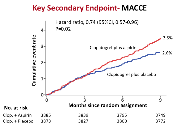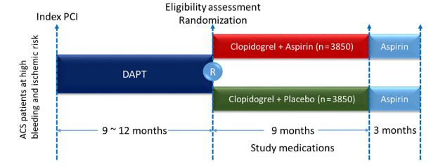 研究纳入101家中心共7758例患者,其中氯吡格雷单药组3873例,氯吡格雷+阿司匹林组3885例。平均年龄为65岁,41%为女性,52%有糖尿病,18%和15%分别有心肌梗死和缺血性脑卒中病史;61.8%为UA,17.5%为NSTEMI,20.7%为STEMI。
