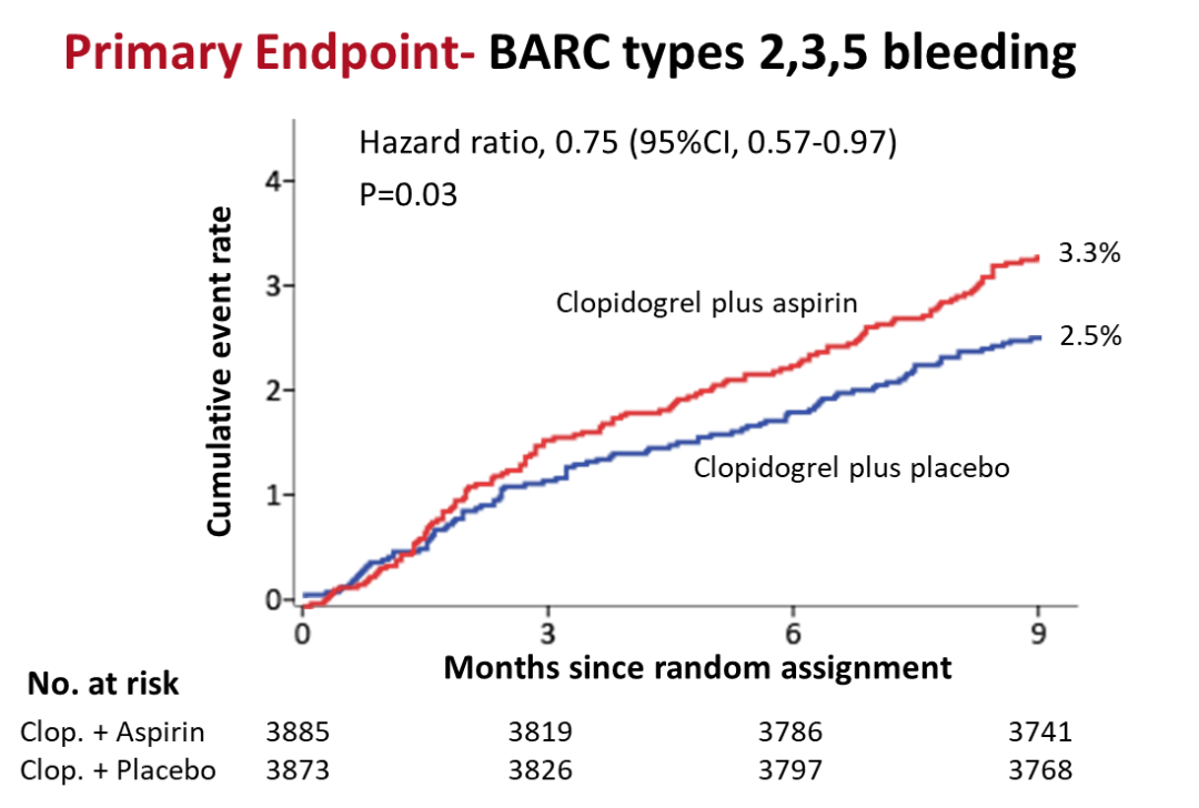 研究主要终点为随机后9个月临床相关出血事件,定义为BARC 2、3或5型出血。